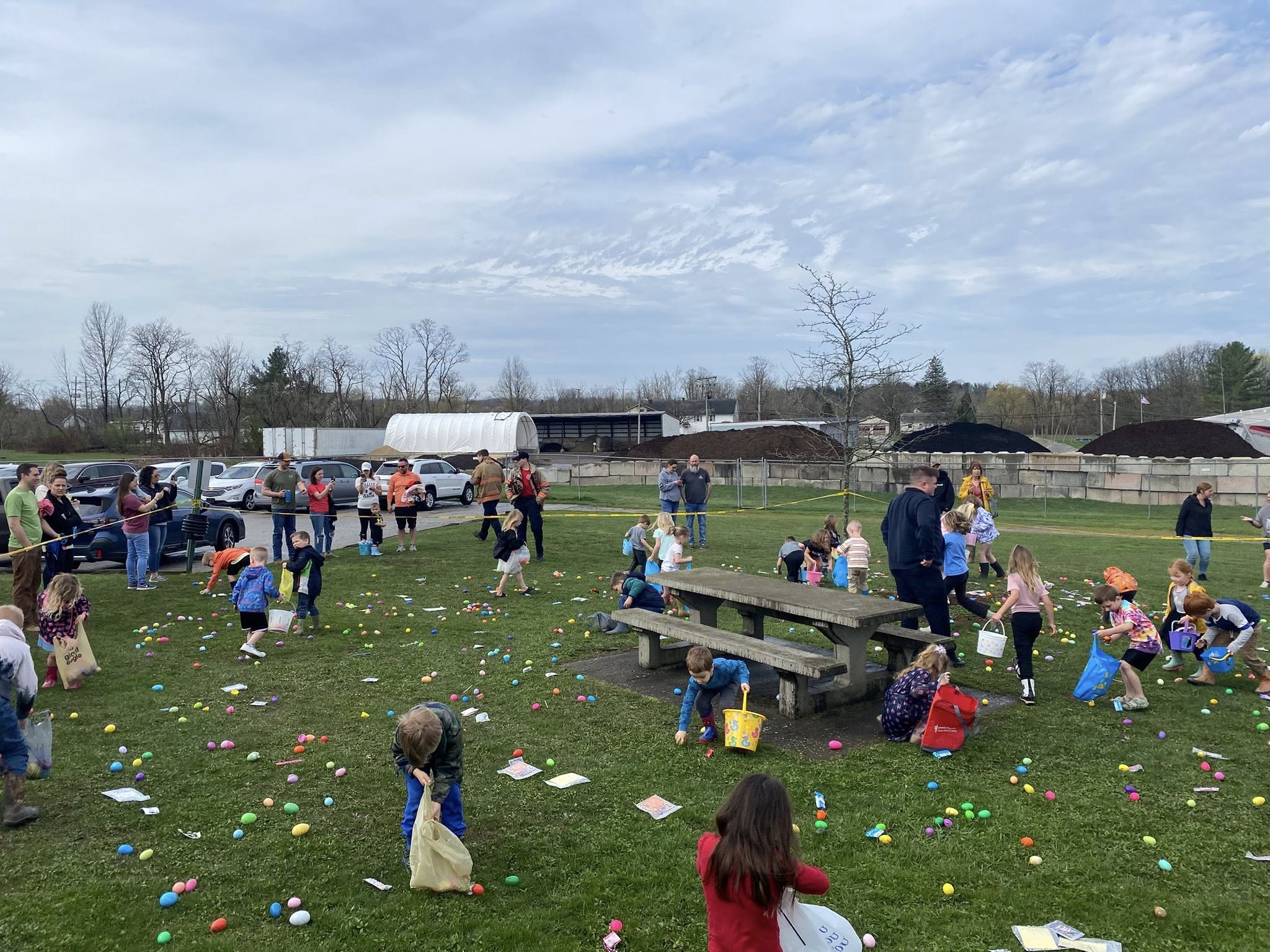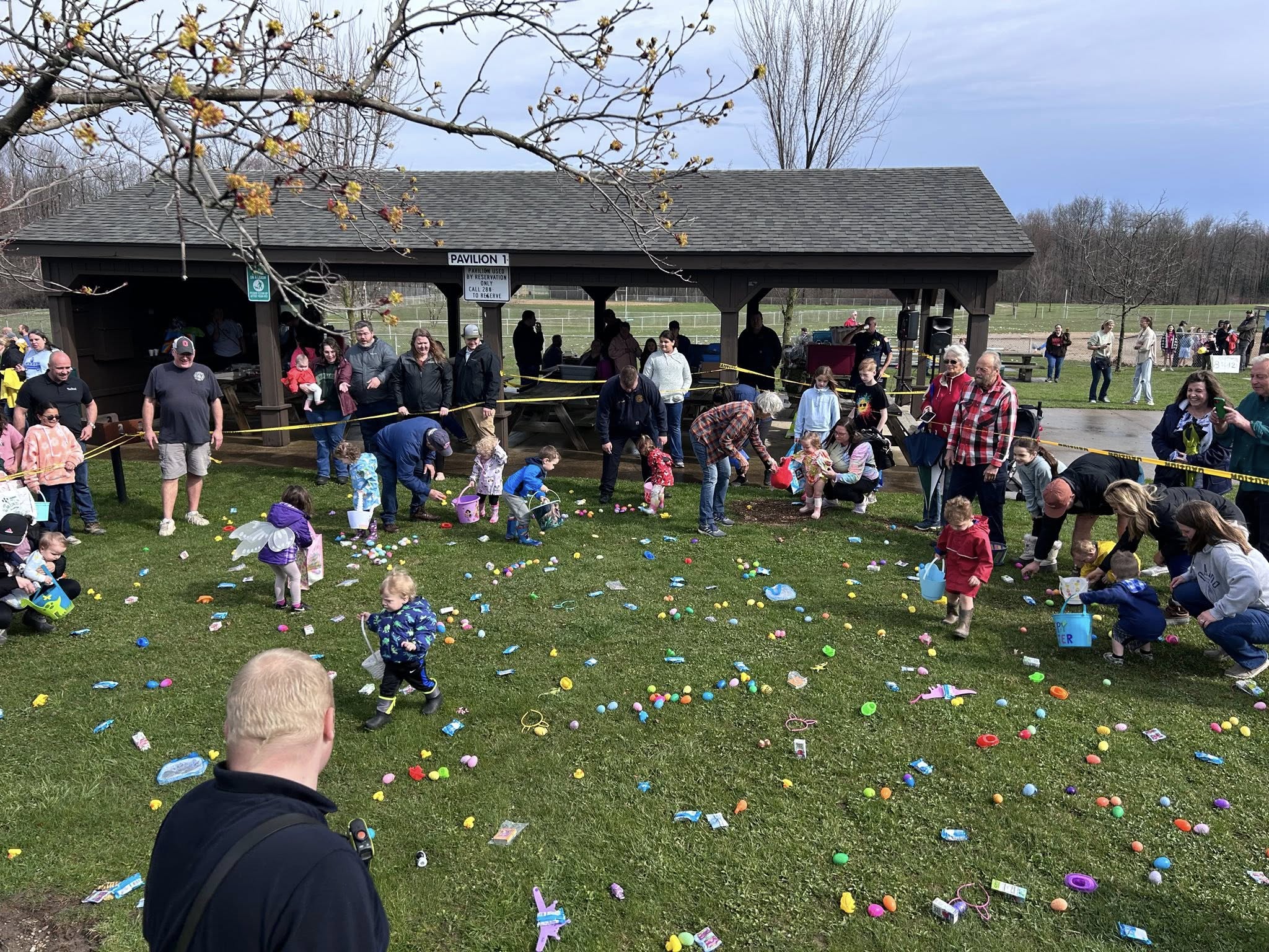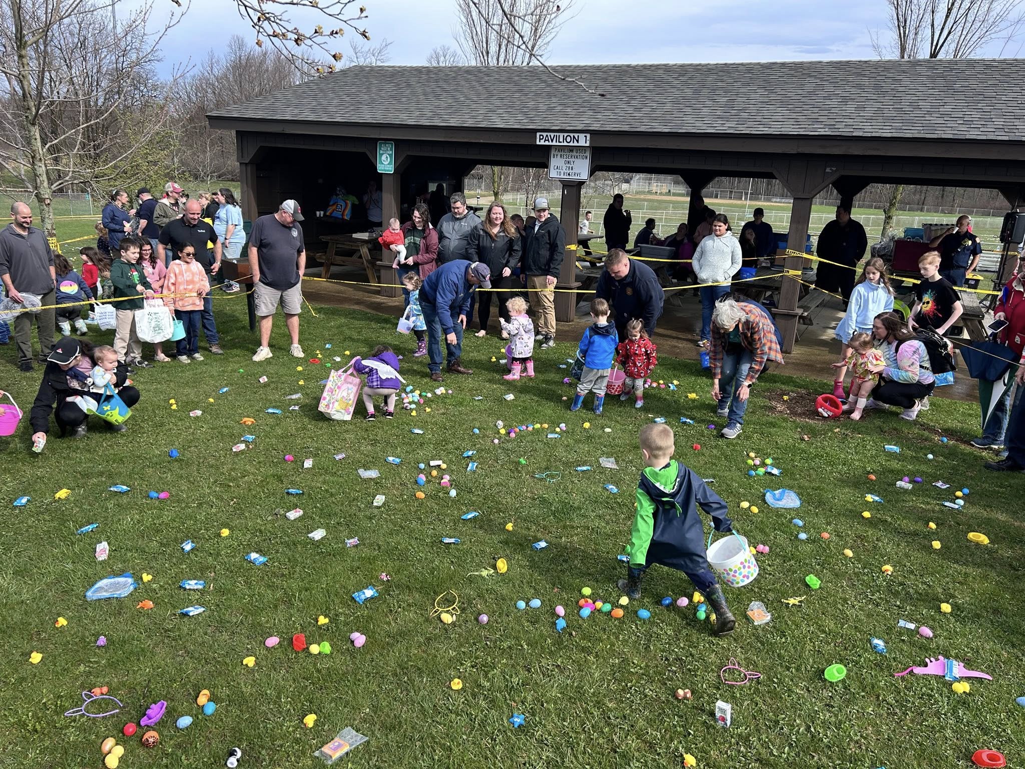 Children and adults gather on a grassy lawn for an outdoor event, picking up colorful eggs and toys scattered on the ground. People stand near a pavilion in the background, watching and taking photos.